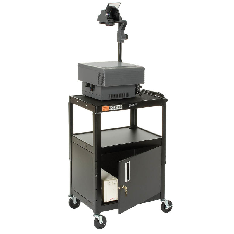 Move and store electronic and other valuable equipment. Shelves adjust on 4″ increments and have a 1/2″ lip to help retain cargo. Top shelf has a vinyl mat to keep equipment from sliding. Convenient push handle and cabling holes. Rolls smoothly on ball bearing rubber casters. Locking Security Cabinet has a 15″H reinforced door with recessed handle and full piano hinge. Assembles easily. Includes 3-outlet power strip with 15 ft. 3-wire cord. 250 lb. capacity.