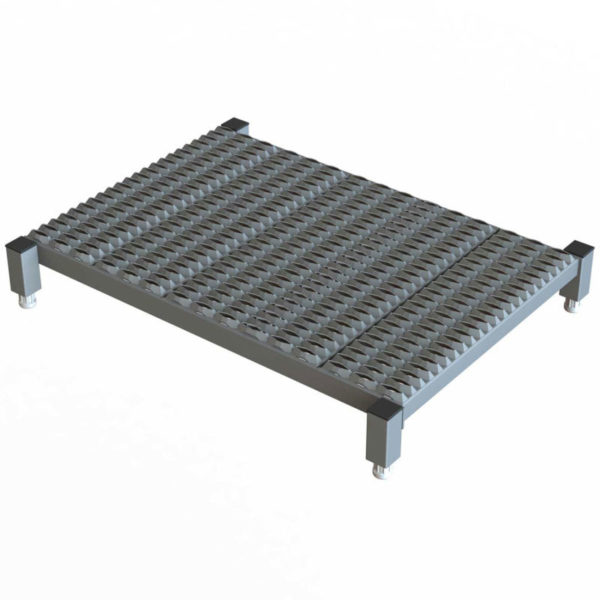 Platform height adjusts to ideal working height. Simply turn the nuts at the bottom of the threaded legs. Make uneven surfaces level. Place several units together for large areas. Grip Strut surface helps prevent slips. Platforms 26″- 48″ long have 4 legs, others have 6. Gray powder coat finish. 24″ W. Meets OSHA and ANSI standards.