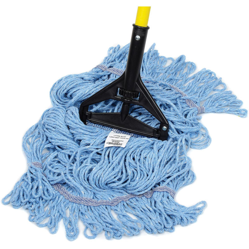 Global Industrial mop handle features plastic quick change head that firmly grips mops. Includes wheel clamp that holds mop firmly in place. Hinged side gate allows quick and easy mop changes. 60″ length x 1″ diameter fiberglass handle. Black/Yelllow.