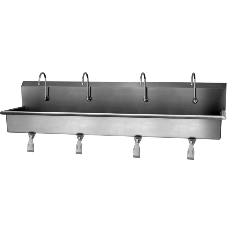 Constructed from 16-gauge type 304 stainless steel. Exposed surfaces have a blended uniform satin finish with a 10″ high backsplash and a 2″ drain opening. Includes (4) Single Knee Pedal Valves, (4) Swivel Gooseneck Spouts with Aerators, (4) Connecting Tubes and Fittings for Valve to Spout Connection, (4) Mixing Check Valve (2) Strainer Assembly with Basket, Wall-Mounting Brackets, (2) Support Brackets.