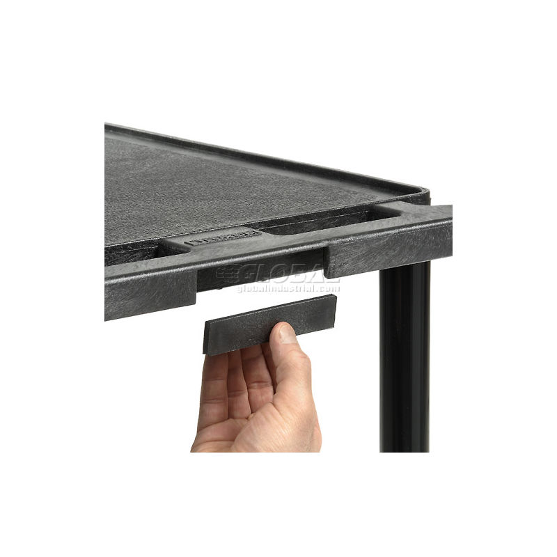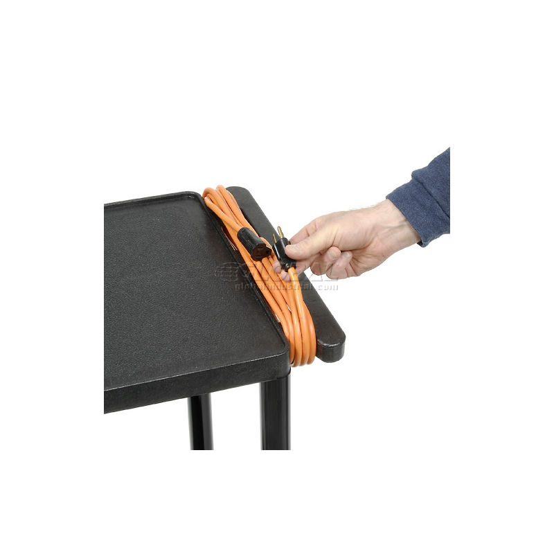 Durable polyethylene, reinforced cart is strong, yet lightweight; ideal for food service applications. Lifetime Limited Warranty Flat Top Shelf offers 1/2″ perimeter retaining lip, best for loading/unloading oversized items. 2-3/4″ deep lower shelf with 26″ shelf clearance. Comfortable push handle has convenient cord wrap molded into top shelf. Rolls easily on durable 4″ non-marring rubber swivel casters (2 with brakes). Easy, snap-together assembly. Optional 3 outlet electric assembly with 15′ power cord is integrally molded into the push handle for convenient power for projects.
