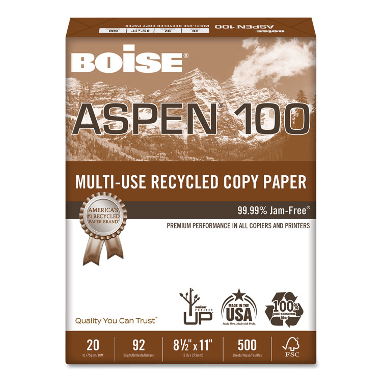 ASPEN 100 Multi-Use Recycled Paper, 92 Bright, 20lb, 8.5 x 11, White, 500 Sheets/Ream, 10 Reams/Carton
