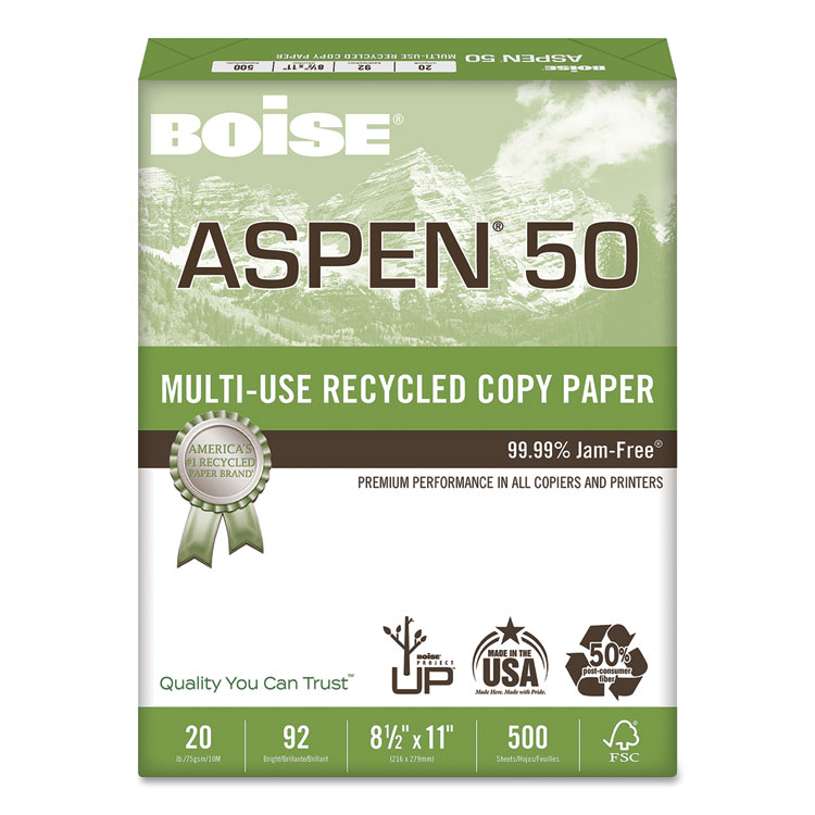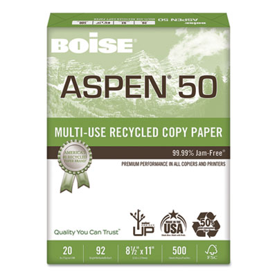 ASPEN 50 Multi-Use Recycled Paper, 92 Bright, 20lb, 8.5 x 11, White, 500 Sheets/Ream, 10 Reams/Carton