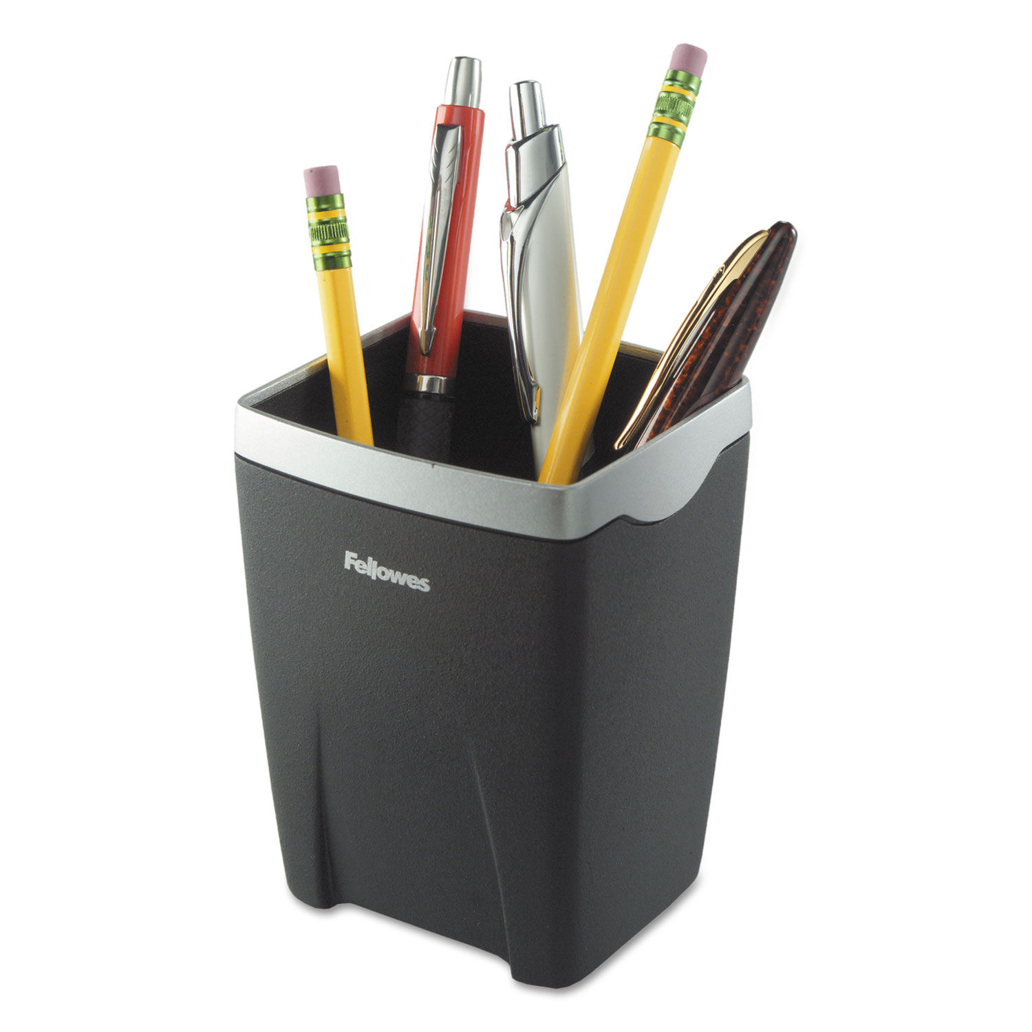 Office Suites Divided Pencil Cup, Plastic, 3 1/16 X 3 1/16 X 4 1/4, Black/silver