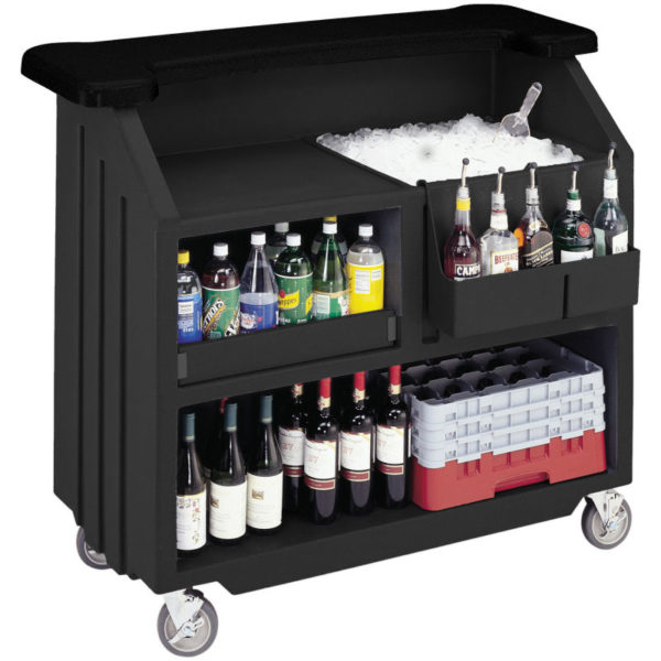 This Black Base with Coal Counter Small Model Portable Cambars is a stylish, portable beverage bars for hosting in any environment. The Small Size Bar is an economical all purpose beverage station for can and bottle service. Made of Impact resistant, waterproof polyethylene. Cambars will not chip, dent, rust or crack. They are easy to clean and to set up for service. Large 5″ swivel casters, 2 locking, offer smooth transport across carpet, cement or grass. This model includes a 5 bottle speed rail and 80 lb. capacity ice sink.
