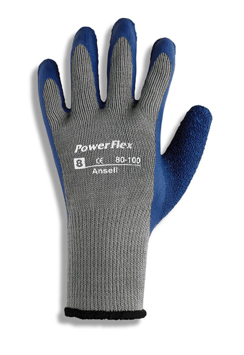 Ansell Size 7 PowerFlex® Heavy Duty Multi-Purpose Work Gloves have blue natural rubber latex palm coating that provides combination of grip, abrasion and puncture resistance. Gloves feature gray polyester, cotton liner and fully coated thumb that delivers high comfort and protection in high risk area. Uncoated back allows air to circulate through the gloves to keep hands cool and dry. Gloves have major applications in carpentry, drywall, roofing, forestry, logging, construction work, stone and tile installation.