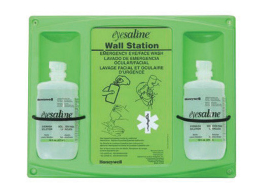 Fend-all® Eyesaline® Honeywell 16 ounce Sterile Saline Dual Bottle Wall Station helps to hold bottles firmly in place with easy access to bottles in an emergency to render immediate flushing. Durable, open-face design wall station can be mounted easily with provided fasteners and with an integral overhang protects bottles from dust and debris to minimize maintenance requirements. Wall station comes with personal eyewash that has an extended flow opening to provide longer flow rate than conventional bottles. Solution renders high visibility in a hazardous area and is readily available for emergency flushing and decontamination of the eyes. Area of application includes airborne particulates, biohazard, chemical, contamination, gas, vapors, smoke and splash.