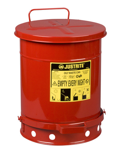 Justrite® Red 10 gal Oily Waste Can with foot lever opening device is made of galvanized steel that can be used for disposal of fabric soaked with solvents, thinners and other flammable liquids. Waste can measuring 13 15/16″ O.D X 18 1/4″ has self-closing lid that opens not more than 60 deg and closes tightly to prevent accidental ignition and spontaneous combustion. Foot-operated treadle-style pedal offers hands-free opening and carrying handle allows can to be moved easily and exterior reinforcing ribs protect against dents. It has round shape and ventilated, elevated bottom that allows air to circulate around the can and to disperse heat, prevent moisture build-up and rust. Safety meets occupational safety and Health Administration regulations and is certified by FM Global and Underwriters Laboratories.