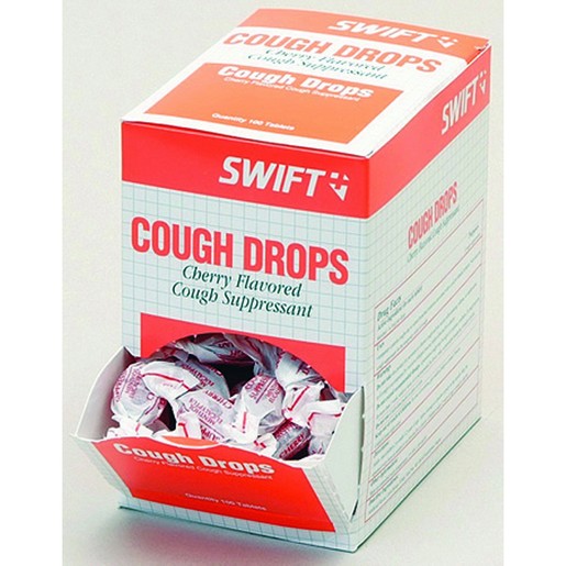 Swift First Aid Cherry Cough Drops controls coughing and dry throat associated with colds or inhaled irritants for a limited period of time, sold as 100 per box.