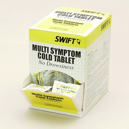 Swift First Aid Multi-Symptom Cold Tablet provides temporarily reduce fever as well as relieve cough, sore throat, minor aches and pains, sold as 2 per pack, 500 pack per box.