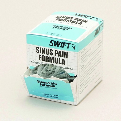 Swift First Aid Sinus Pain Tablet provides temporarily relieves sinus pain, headache and nasal/ sinus congestion without pseudoephedrine, sold as 2 per envelope, 100 each per box.