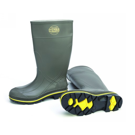 Servus® By Honeywell PRO® Size 10 Men’s Safety Knee boots feature dual compound outsole and “Safe-Toe” steel toe. Gray/yellow/black PVC knee boots with 15″ height feature extended ribbed steel shank to provide optimum support. Boots featuring TDT (Triple Density Technology) are 3-stage injection-molded for enhanced chemical resistance. The TDT outsole compounds provide longer, comfortable wear while increasing slip resistance and help reduce inventory costs. It also comes with removable and washable ergonomic insoles for improved comfort. 100% Waterproof seamless boots are ideal for use in meat, petrochemical and petroleum processing industries. It meets ASTM F2413-11 M I/75 C/75 standards.