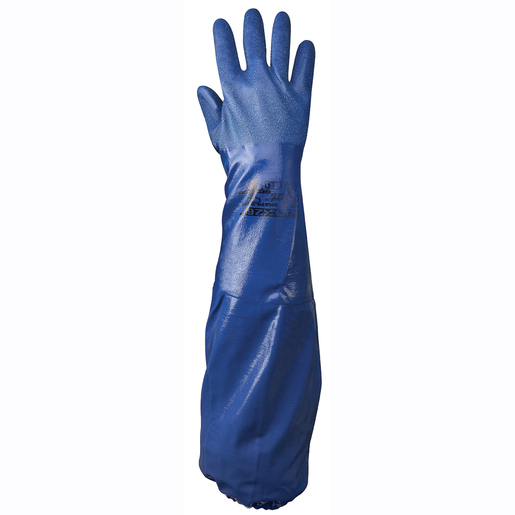 SHOWA™ NSK-26™ X-Large Size 10 Cotton Interlock Lined Royal Blue Chemical Resistant Gloves with gauntlet cuff are made from dipped 100% nitrile over a cotton liner for enhanced durability. 26″ Rough finish gloves with excellent textured grip provide maximum comfort and touch sensitivity. It features extended liquid-proof 2-mil sleeves for improved splash resistance. Super flexible, watertight knit-lined nitrile gloves offer great protection from a wide array of solvents, oils and acids in the hand area and splash protection in the long sleeve. Gloves with its rough textured finish deliver a sure grip in even the most oily and wet applications. Its interlock liner offers an added degree of comfort and protection. Nitrile coated gloves find wide range of applications in animal husbandry, painting, refineries, chemical splash protection, sewer and tank cleaning, protection from fuels, deep-sea fishing, agricultural spraying, oily greasy applications and municipal water treatment. Gloves can be washed at 40 deg C using a neutral detergent. Durable nitrile coating offers excellent protection against a wide range of chemical substances. Antibacterial treatment allows greater hygiene while the elastic band and grommet holds the sleeve up on the arm for user convenience.