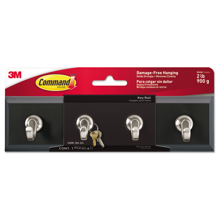 Decorative Key Rail, 8w x 1 1/2d x 2 1/8h, Black/Silver, 4 Hooks/Pack