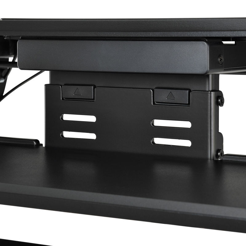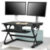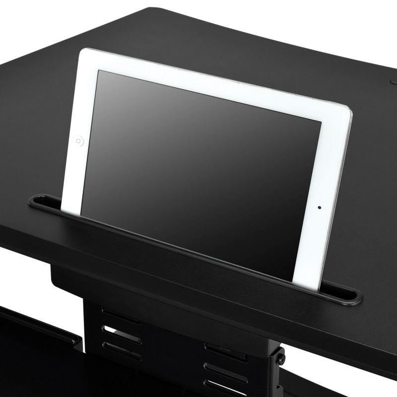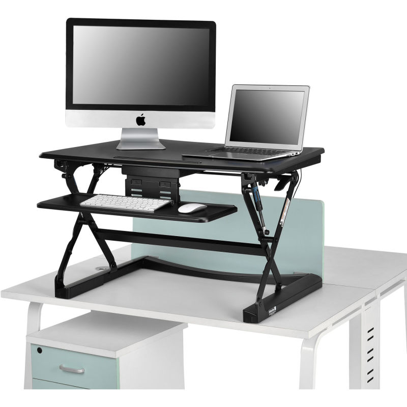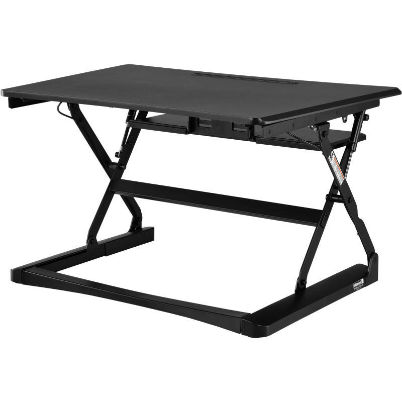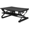The Interion By Global Industrial Height Adjustable Sit-Stand Desk Converter has a 35″ wide platform with a retractable keyboard tray. The work surface over the retractable keyboard tray can support laptops as well. The Interion’s standing desk converter provides an easy way to transition between sitting and standing throughout the workday. The height adjustable sit-stand desk converter offers smooth up/down motion and the 35″W x 23-1/2″D platform can raise and lower in various increments from 6″ to 20″ in height. The 25-1/4″W x 9″D retractable keyboard tray rests close to your desk in the sitting position to maintain ergonomic posture. The platform on the sit-stand desk converter has ample surface area to support two 21″ monitors and the gas-lift springs are optimized for the total peripheral weight of 33 lbs. including the keyboard. Convenient tablet stand built into platform. Cable management included. Comes pre-assembled with removable keyboard tray detached.