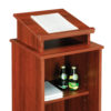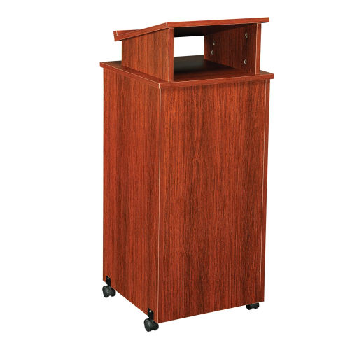 Highly durable presentation Podium / Lecterns are made with a thermal fused melamine laminate and finished with a matching PVC edge. Mobile Podium / Lecterns include an adjustable shelf in the lower compartment for additional storage space. Raised, angled reading surface platform for ease of literature viewing. Also includes swivel casters for mobility. Meets ANSI/BIFMA standards.