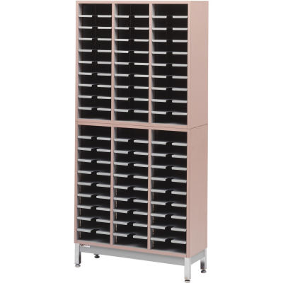 Comprised of two 31-1/2″ high sort modules secured to a 6″ heavy gauge painted steel base with leveling glides, openings adjustable in 1″ increments