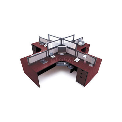 Laminate workstation collection offers high quality seating for multiple employees. Create a comfortable, aesthetically pleasing work environment for your office with this selection of laminate workstations. Pre-configured workstations meet the modern day office needs for any business. Durable 3 mil PVC tough edge on all exposed edges. Desktops include cable management grommets. Full pedestals included. Pedestals feature ganged cylinder lock for security and flared drawer pull handles for an enhanced look. Drawers feature steel ball bearing slides for smooth operation. Desks include adjustable leveling feet. Desk mounted panels attach to work surface to enhance decor and provide a frosted panel partition between workstations. Workstation consists of three credenza desks with corner extension, three reversible returns, two box/box/file pedestals, one file/file pedestal and desk mounted panels. GreenGuard certified.