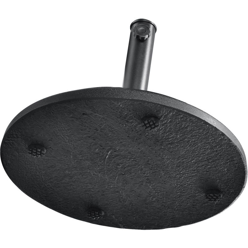 Sturdy concrete Umbrella Base with tube stem can be used to house any outdoor umbrella with a pole of up to 2″ in diameter. 18″ Round base and 11″H stem offers plenty of support. Plastic insert adapter allows the base to fit most umbrellas. Set screw included to secure umbrella. Umbrella Base is slightly heightened by small feet to keep the base off the ground so dirt and moisture do not get trapped and discoloration of your floor surface does not occur. Durable finish is weather and rust resistant.