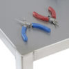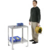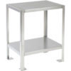 The machine stand is designed as a storage capable, work surface for multiple environments including industrial, manufacturing, assembly line, and more. The 16 gauge stainless steel shelves provide convenient, out of the way storage for smaller items and materials when not in use. The tables feature 16 gauge, 1-1/2″ thick angled uprights for heavy duty content support. The heavy-duty welded, steel construction ensures durability and strength for years of reliable service. The polished # 4 stainless steel finish provides an added layer of protection against rust and corrosion. Includes welded mounting plates for reinforced floor anchoring. Features a 20″ shelf clearance. Weight capacity is 1200 lbs. Dimensions are 24″W x 18″D x 30″H.