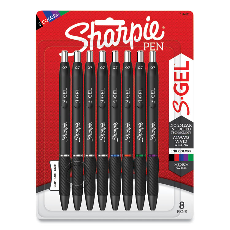 S-Gel High-Performance Gel Pen, Retractable, Medium 0.7 Mm, Five Assorted Ink Colors, Black Barrel, 8/pack